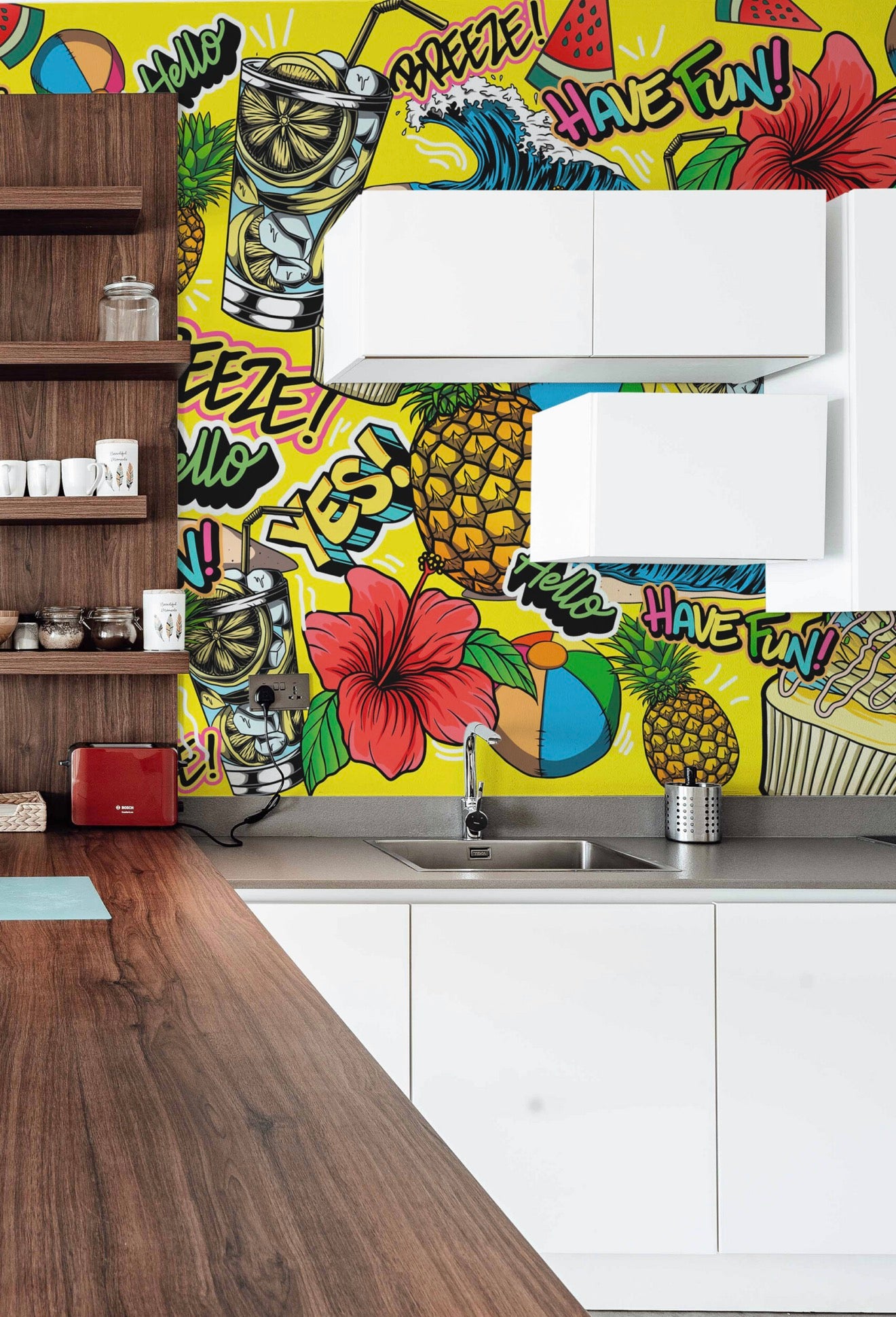 Beach Party Pop Art wall mural bursts with bold tropical energy, featuring bright pineapples, hibiscus flowers, beach balls, cocktails, waves, and playful comic-style lettering layered over a vibrant yellow background. The dynamic mix of graphics and summer icons creates a fun & funky statement design that feels energetic and carefree, making it perfect for game rooms, teen spaces, creative studios, or lively entertainment areas.