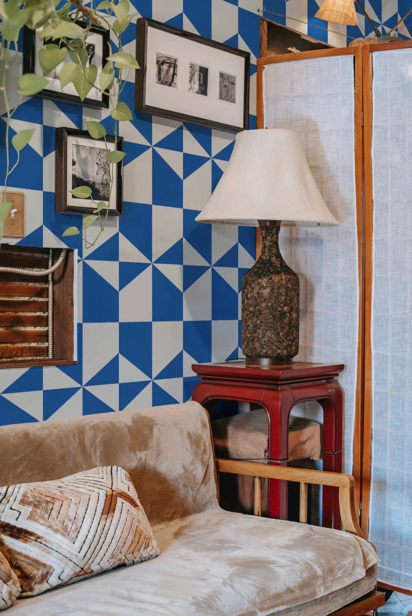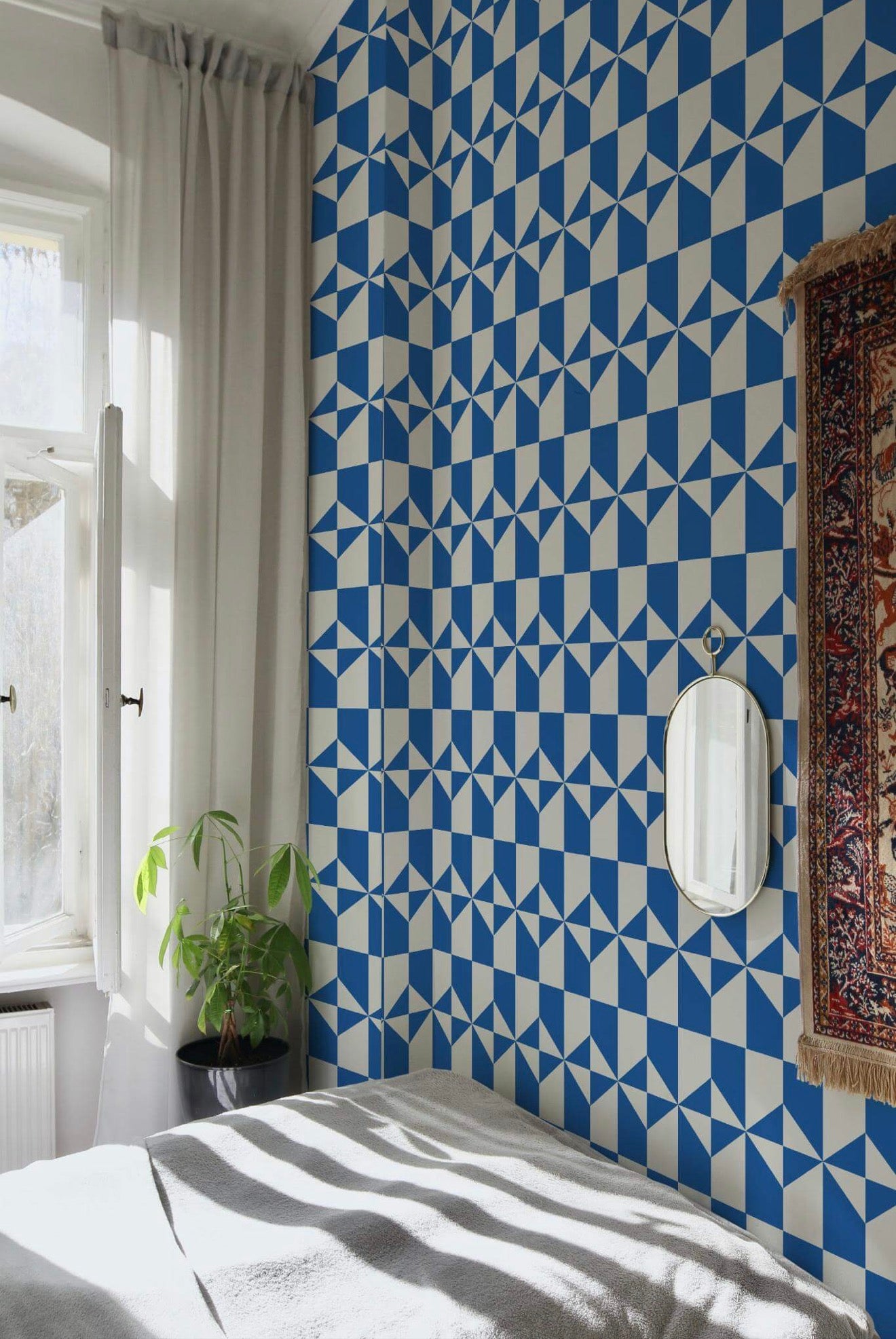 Coastal Blue Harmony wallpaper is a bold masterpiece that combines dynamic geometric patterns with rich blue and off-white hues, perfect for transforming any accent wall into a modern work of art. This chic and trendy design adds a contemporary flair to any room, making it ideal not only for accent walls but also for elevating living rooms, bedrooms, or home offices with its minimalistic yet striking presence.
