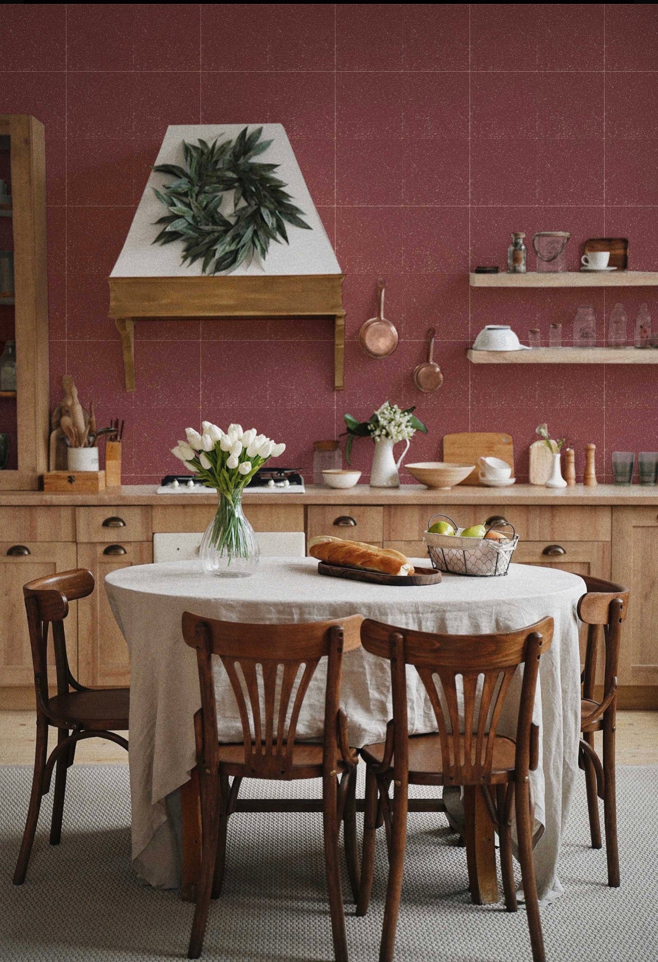 Bring warmth and character to any room with this red tile wallpaper. Featuring rustic fading and a subtly worn look, it adds a vintage charm and cozy, lived-in feel to your walls. Perfect for creating an inviting accent wall or a statement backdrop in kitchens, living spaces, or cafés.