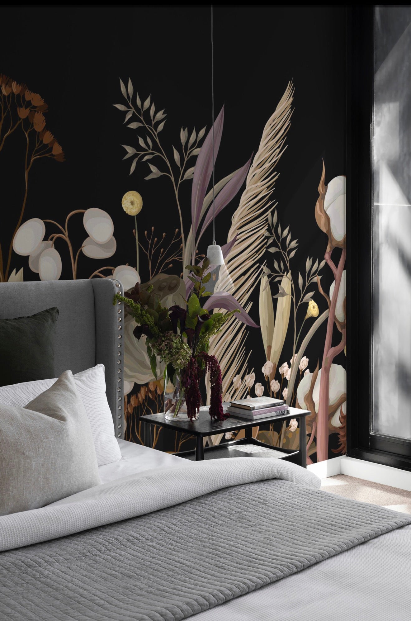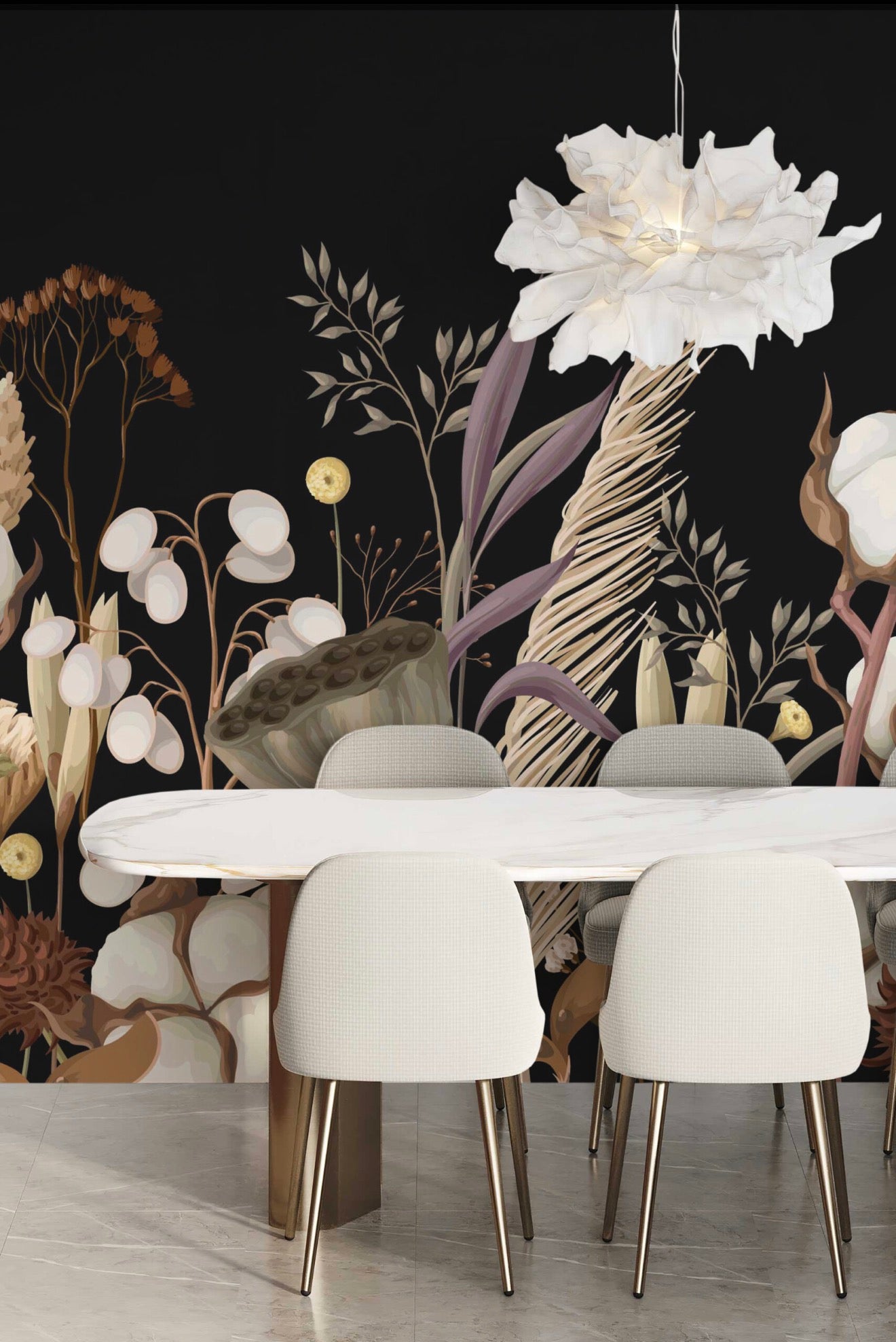 Dark Wildflower Elegance wall mural captures a muted botanical meadow in rich brown tones set against a deep, dramatic background, creating refined contrast and quiet sophistication. Delicate florals, dried stems, and natural textures form an elegant botanical composition that feels organic yet polished, making it ideal for art deco interiors, moody living rooms, or statement feature walls with a luxurious atmosphere.