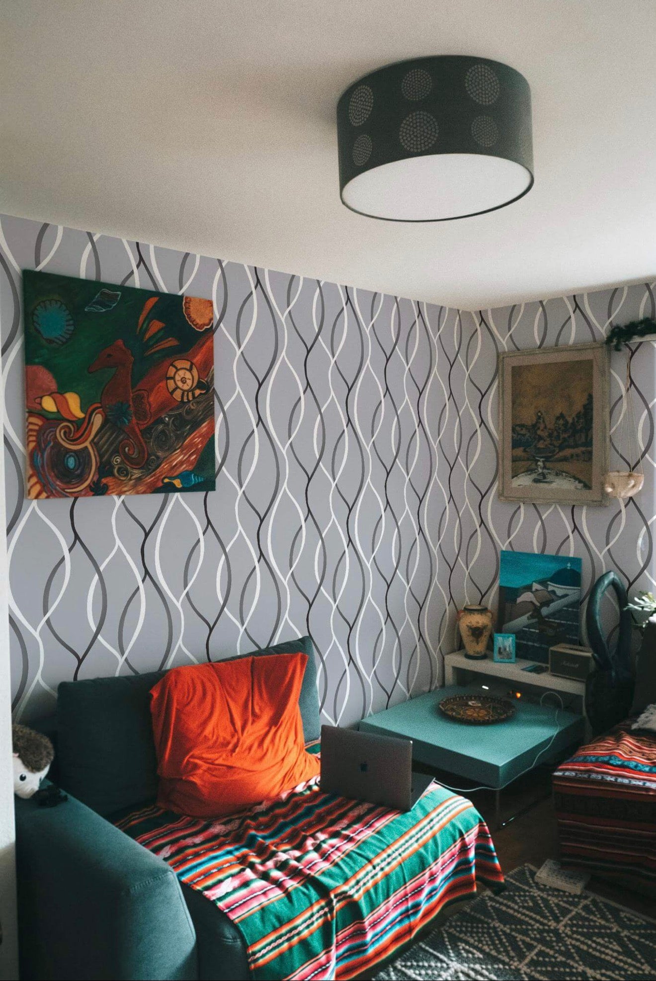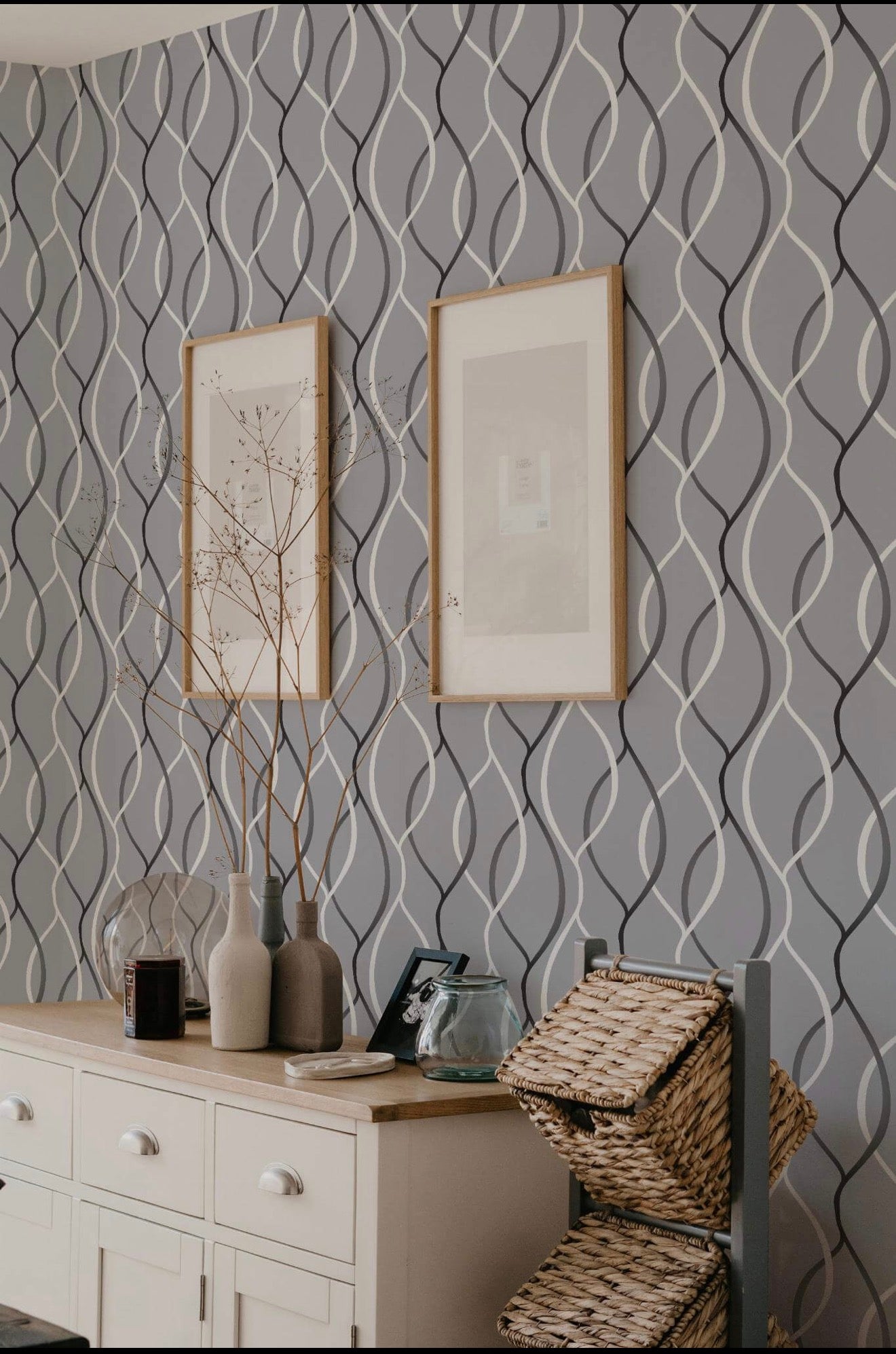modern touch to your living room with its elegant line art pattern in soothing shades of gray and white on a light gray background. This minimalist design creates a dynamic and flowing atmosphere, making it an ideal choice not only for living rooms but also for any space where you want to introduce an air of contemporary sophistication.