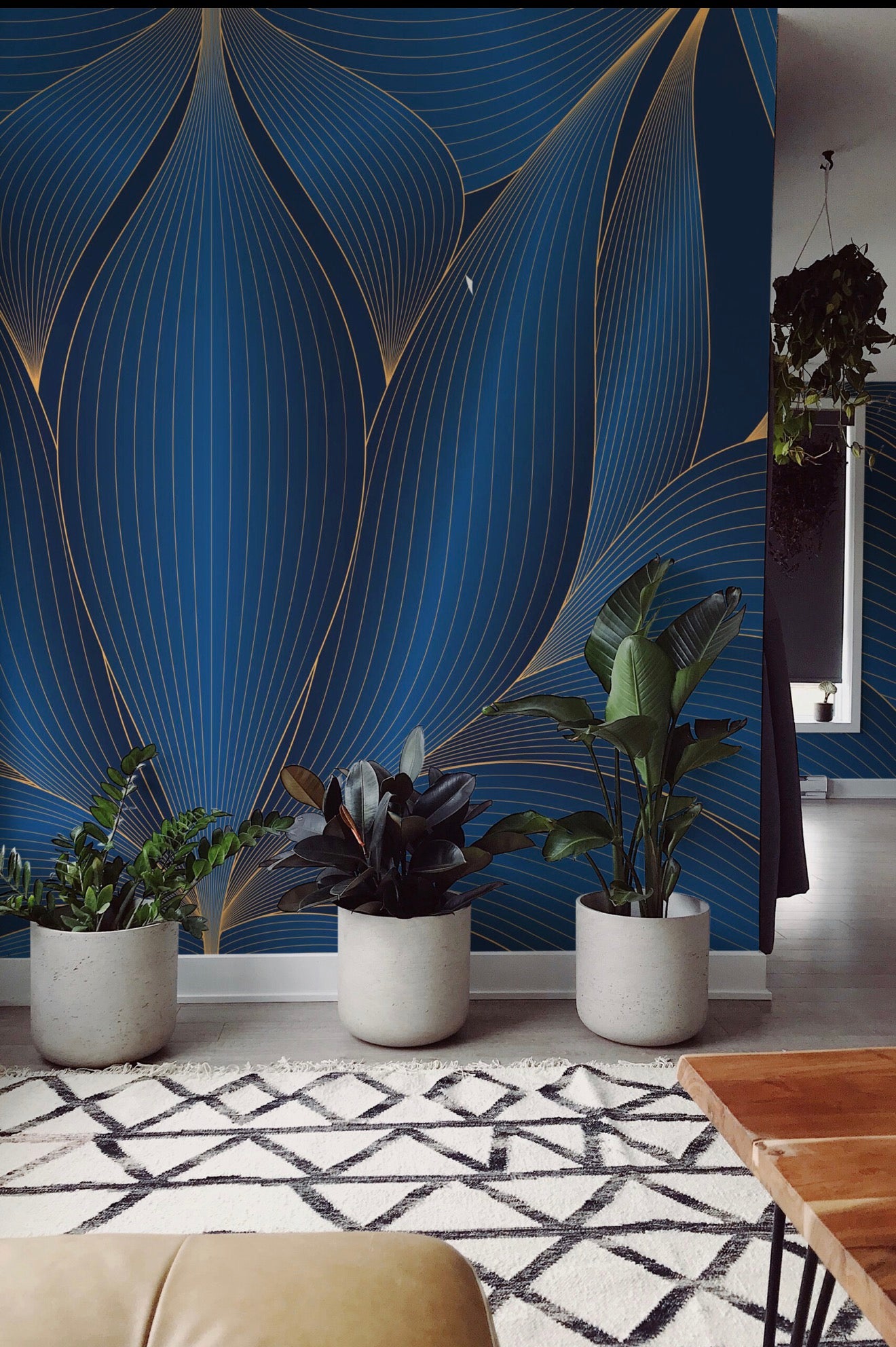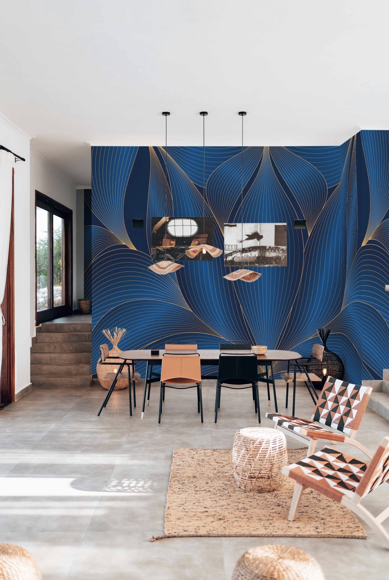 Midnight Water lilly wall mural captures the timeless allure of Art Deco design through elegant blue and gold hues, perfect for bedrooms or sophisticated living spaces. The bold line art of this floral-inspired piece evokes graceful movement and refined symmetry.