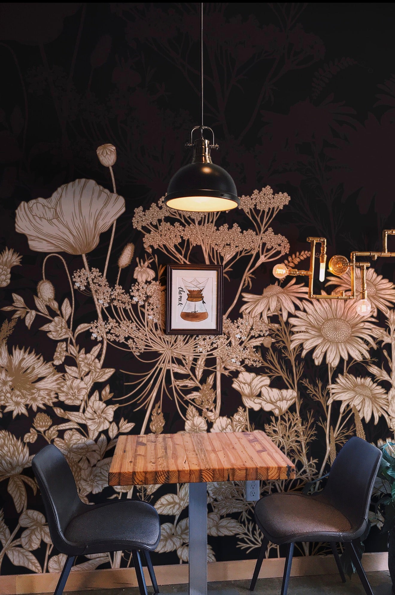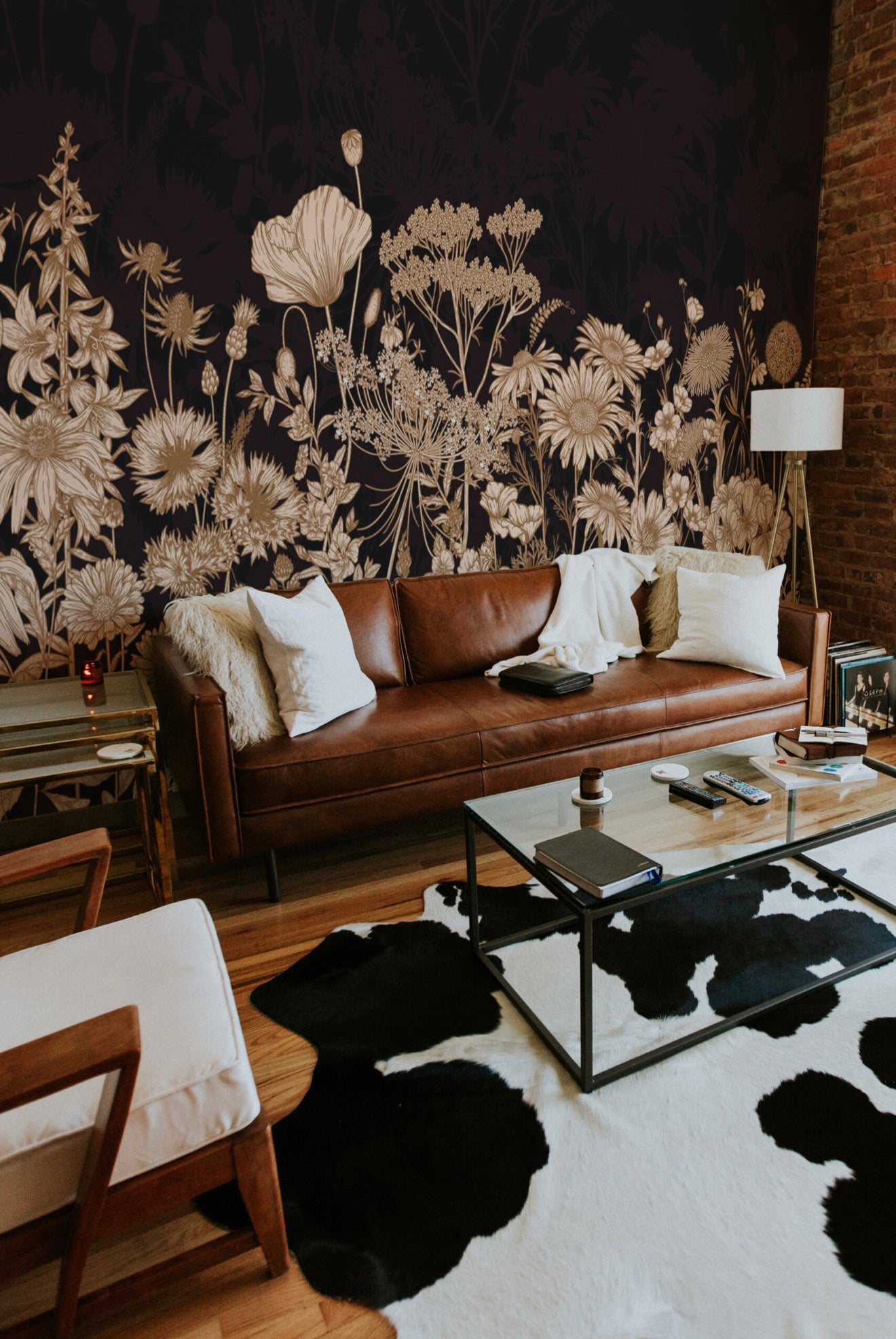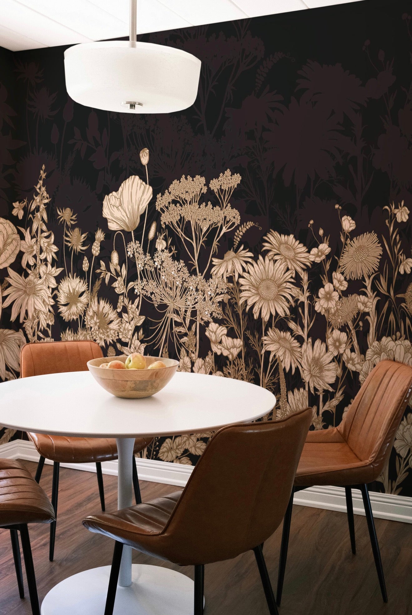 Midnight Wildflowers wall mural brings a calm yet dramatic botanical mood to living rooms with muted beige meadow flowers layered over a deep dark background. Soft brown floral silhouettes create elegant contrast while maintaining a balanced, understated presence, making this design ideal for moody interiors, art deco inspired spaces, or refined statement walls.