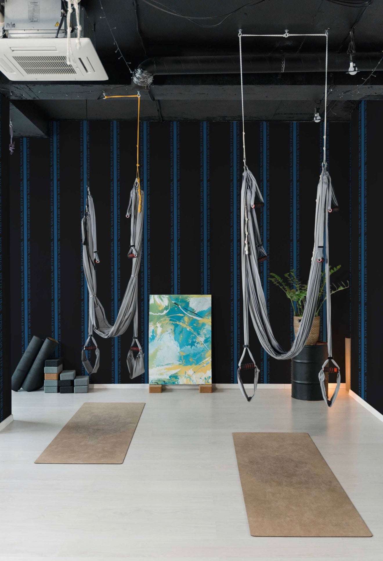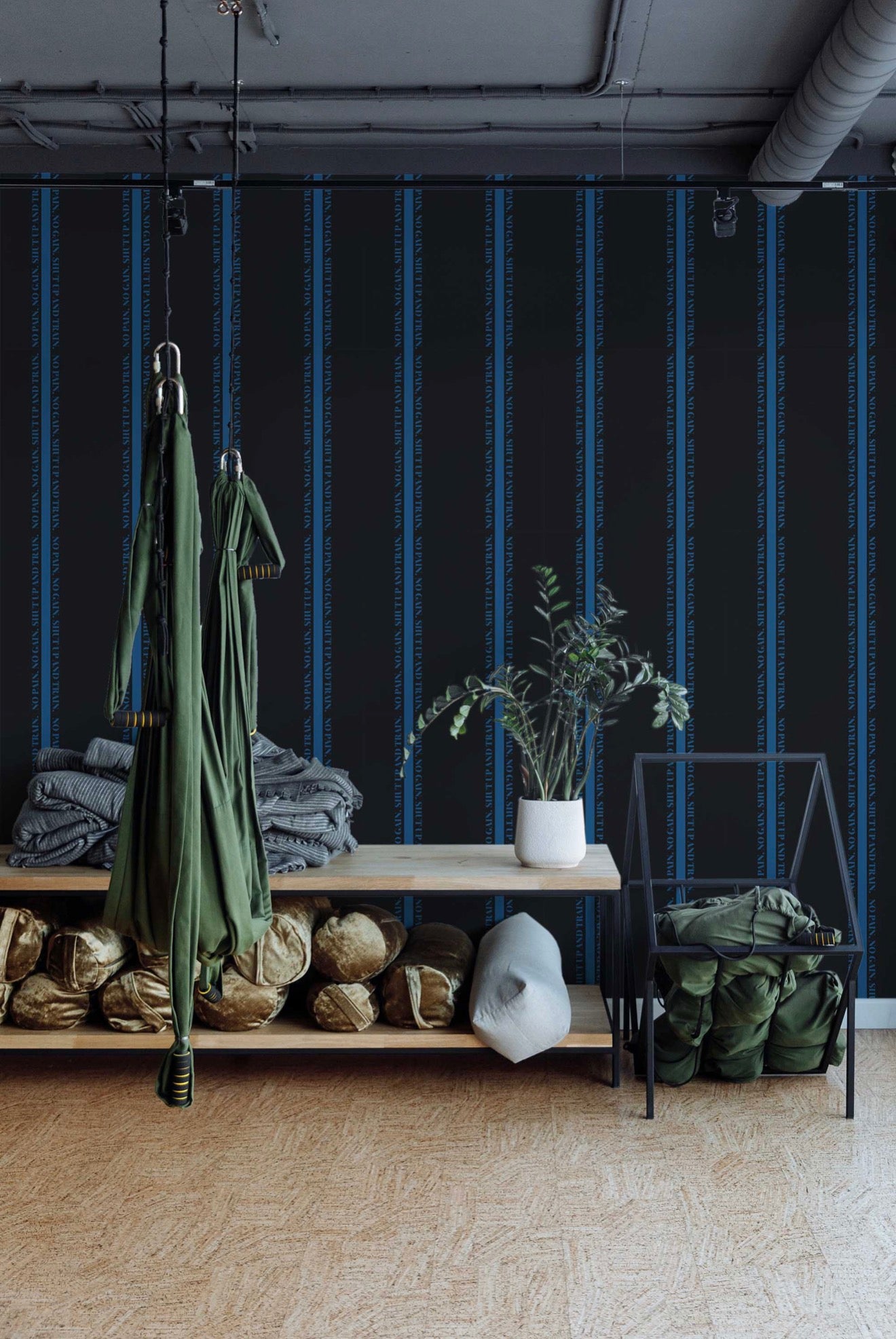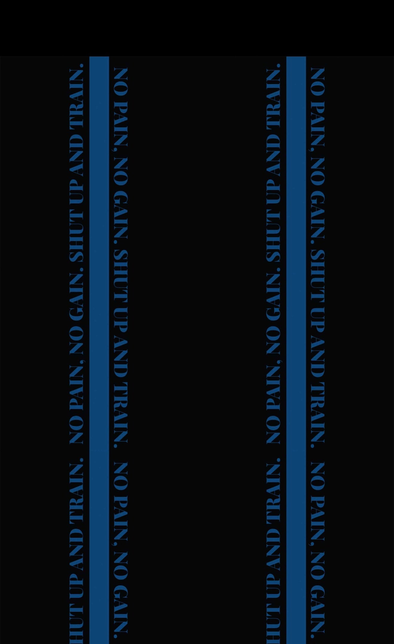 Black back ground, blue stripes, with lettering “no pain, no gain, shut up and train